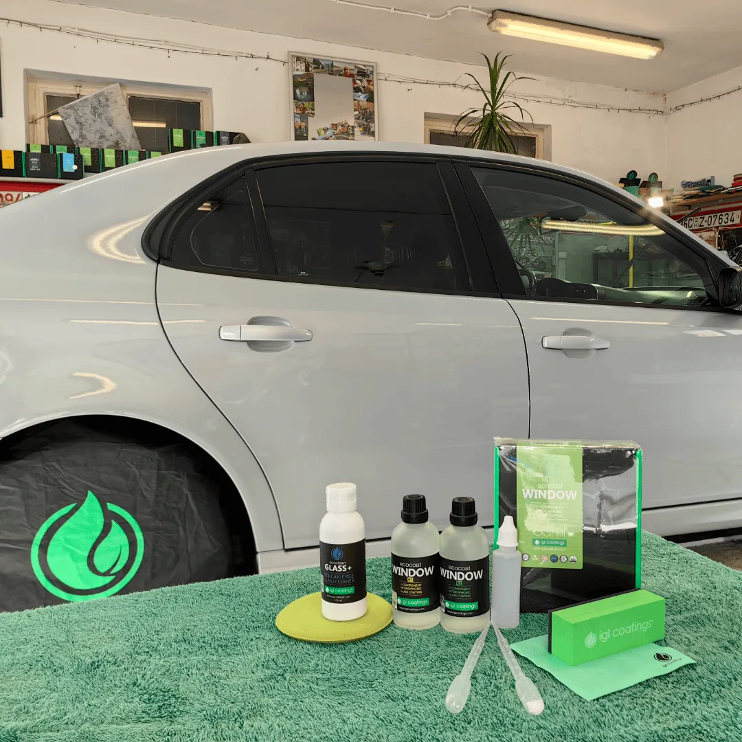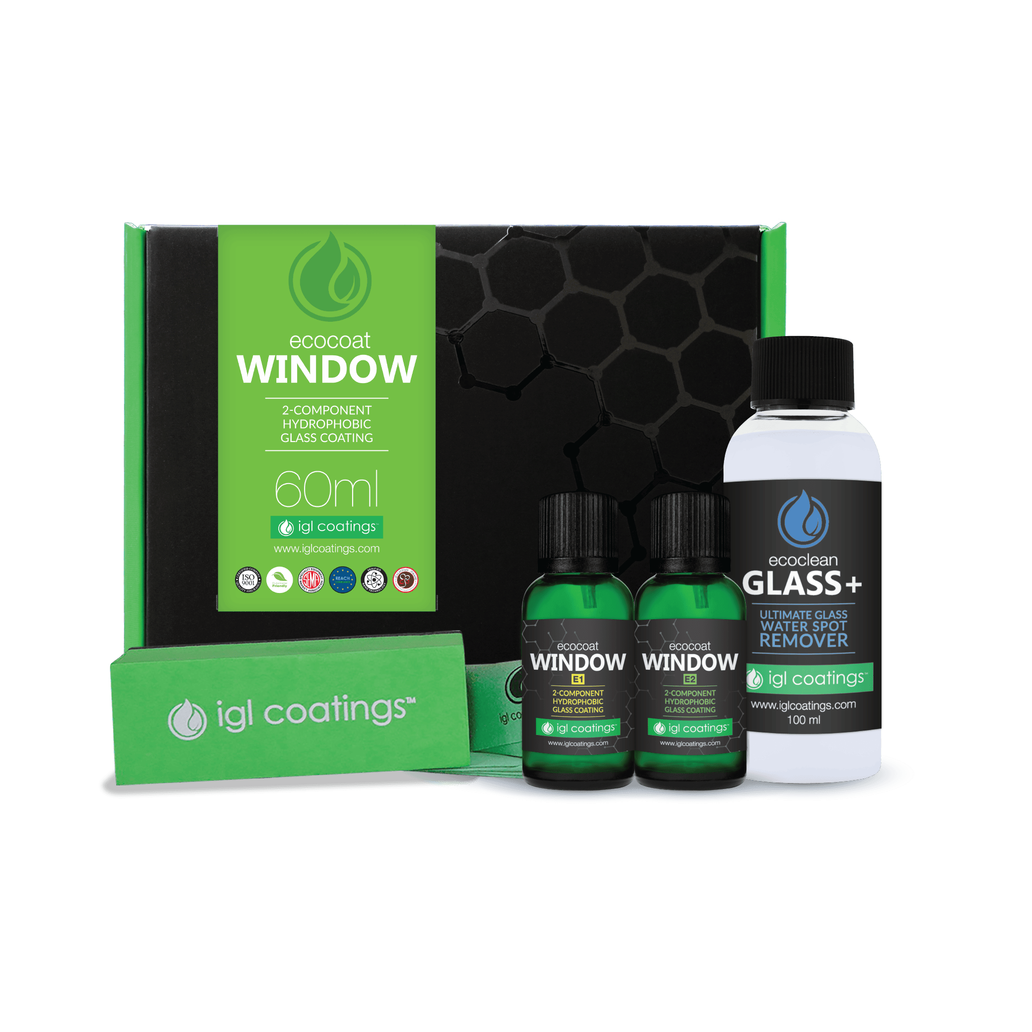 Szett: WINDOW E1 + E2 komponensek, IGL Ecoclean Glass+, applikátorblokk, mikrószálas kendők és részletes útmutató